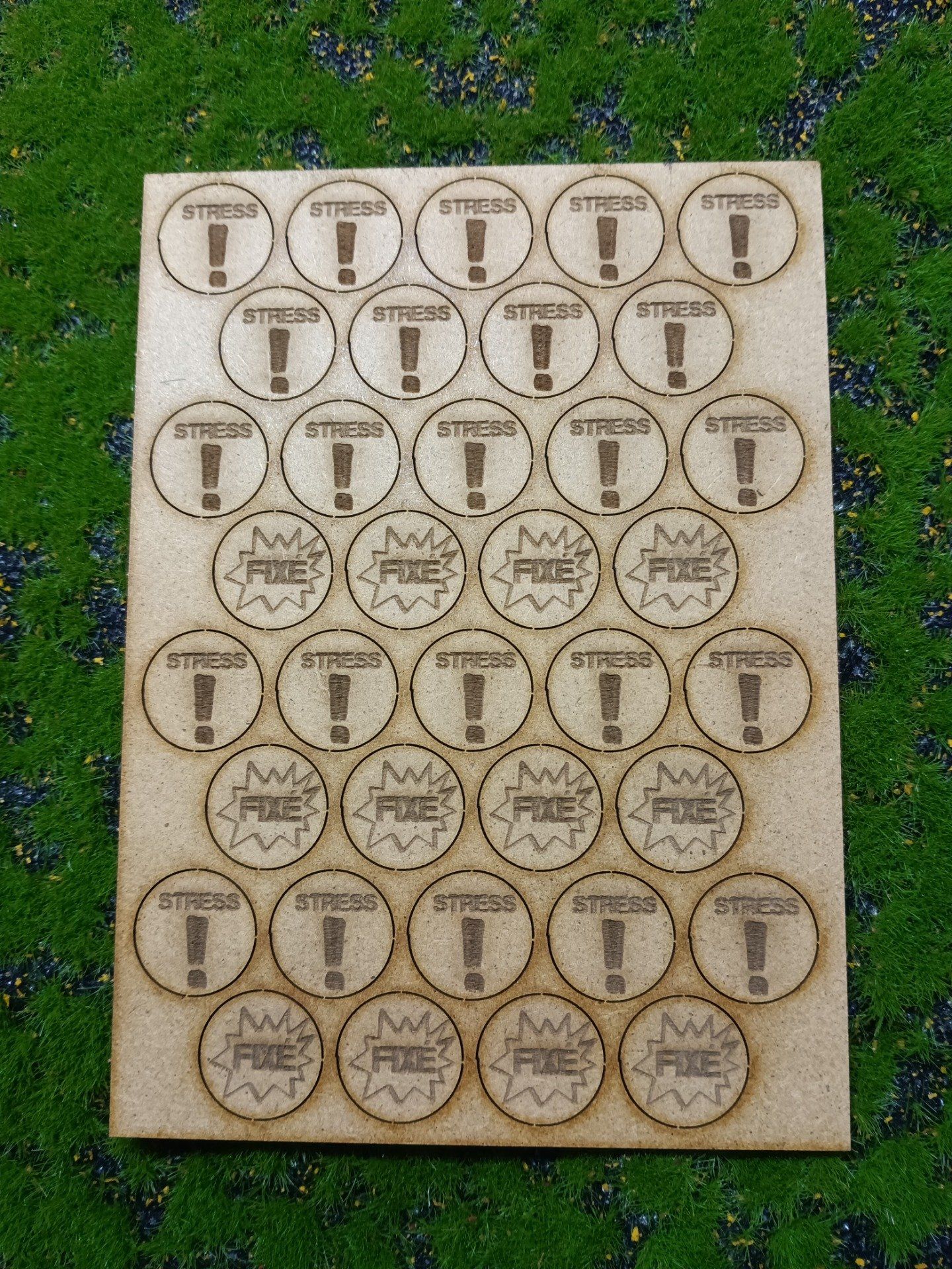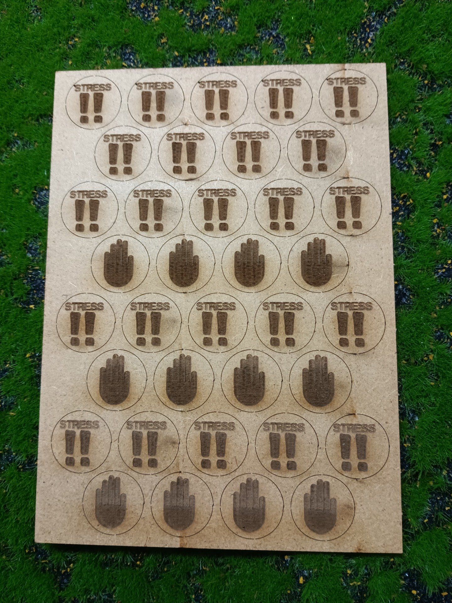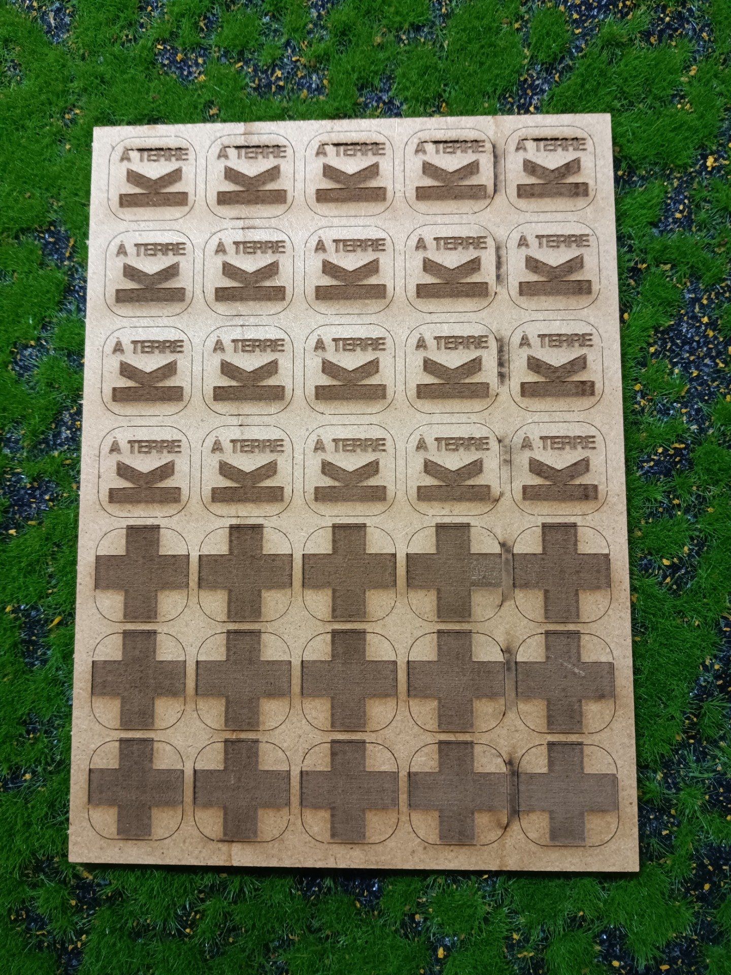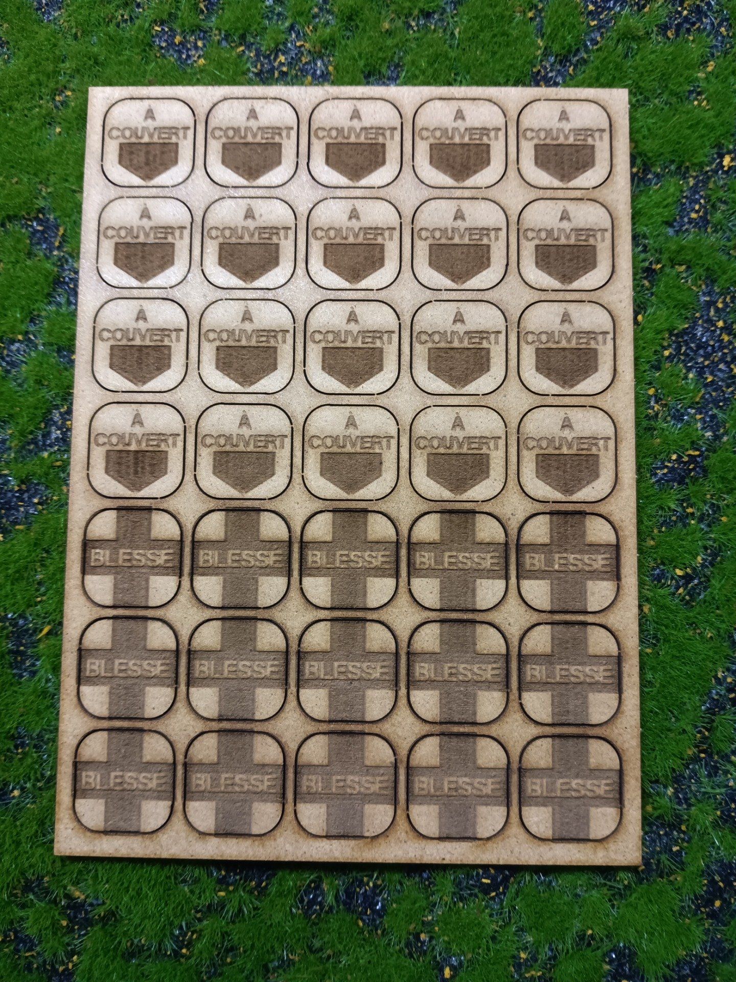 Le set contient 3 planches au format A6, pour un total de 106 jetons découpés au laser et gravés recto/verso.