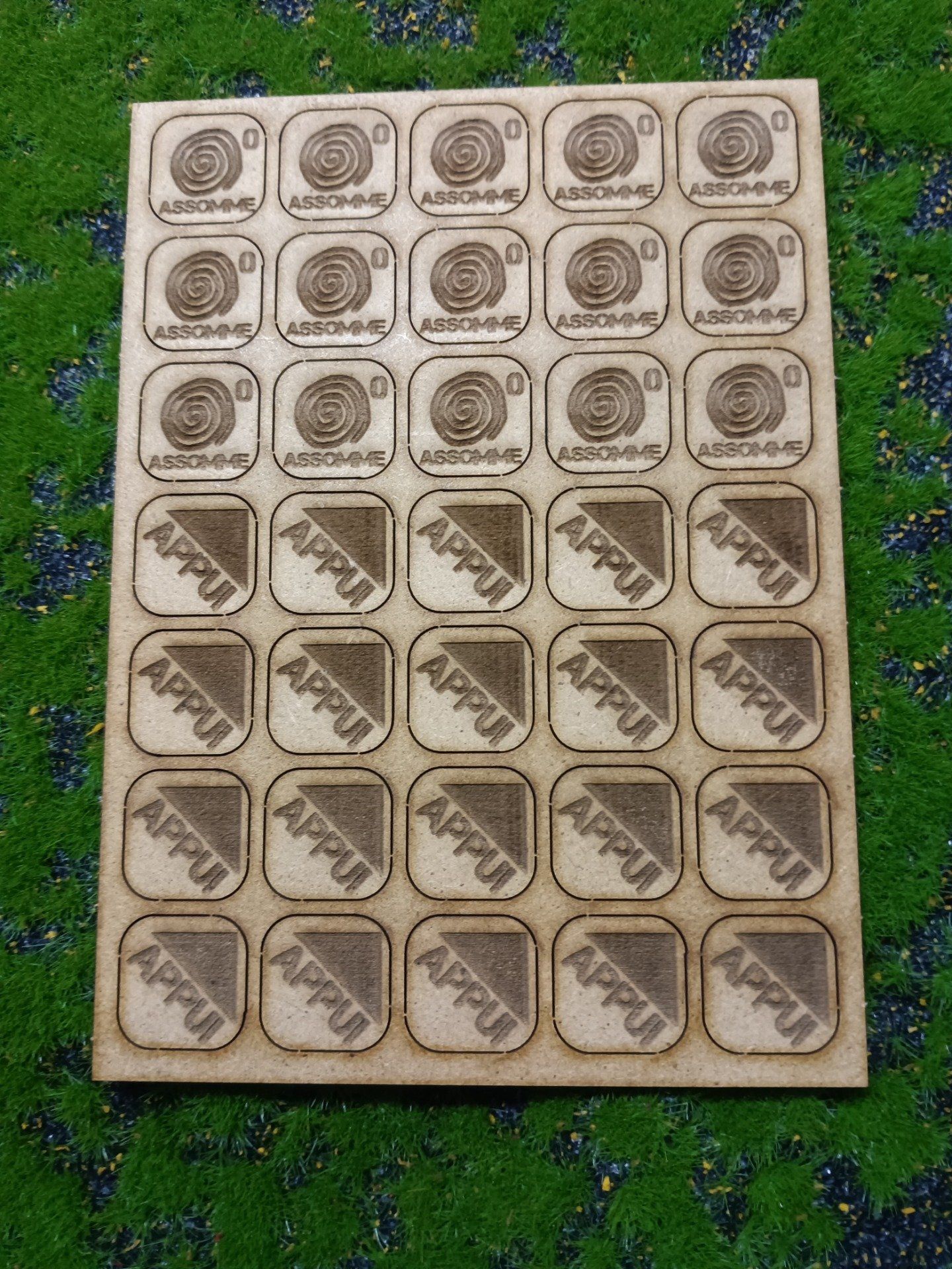 Jetons en MDF de 2.5mm découpés et gravés au laser